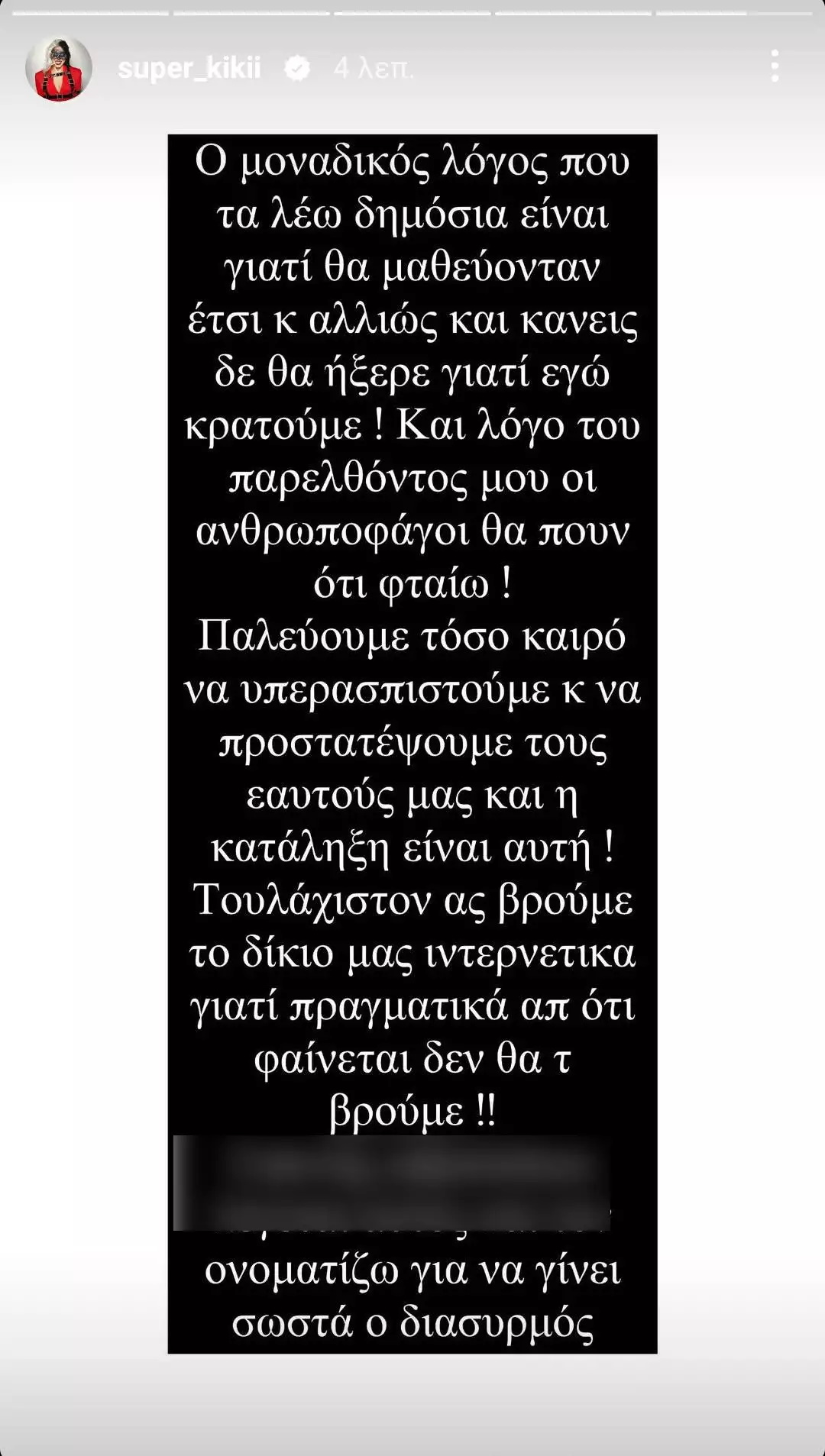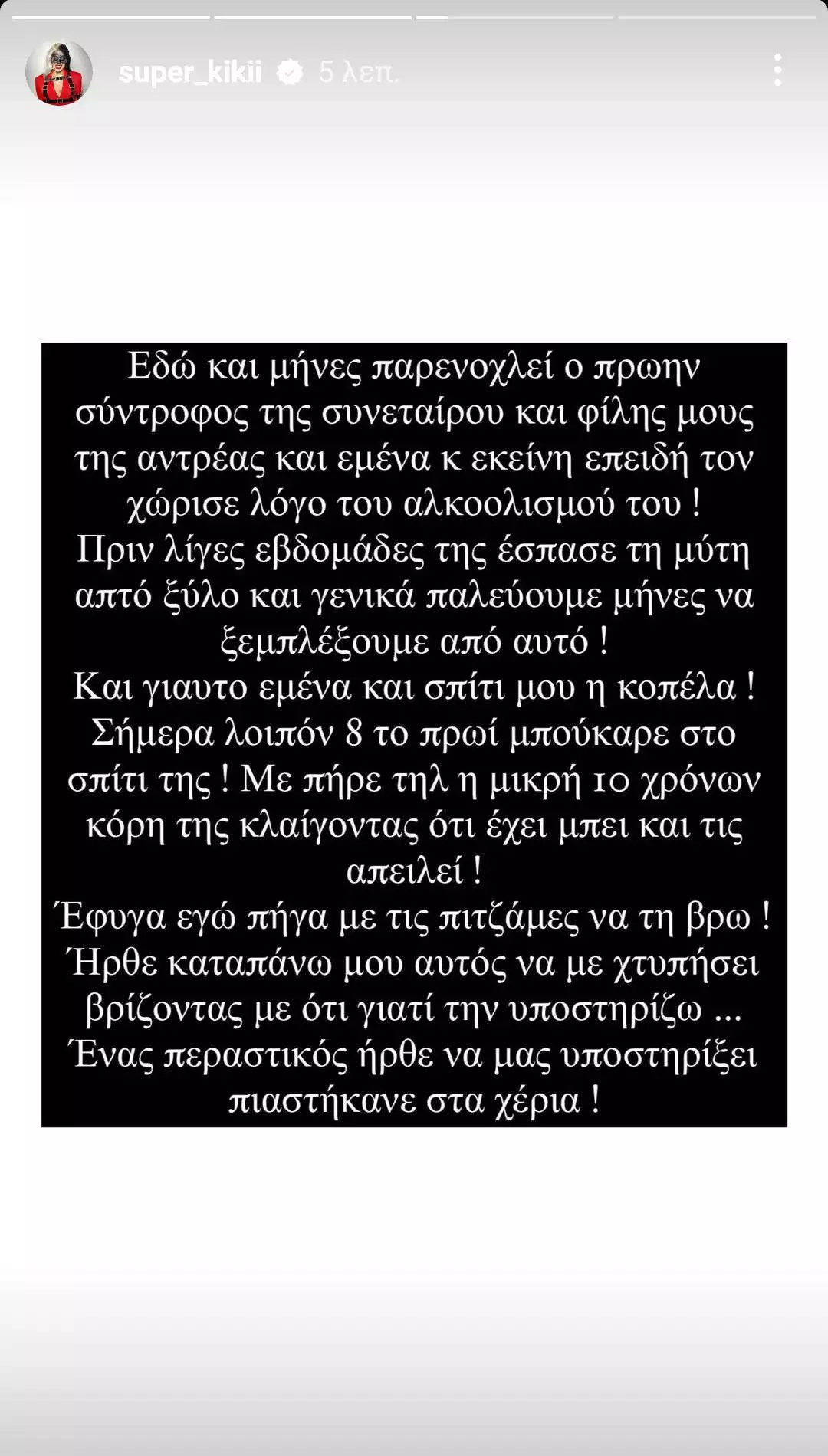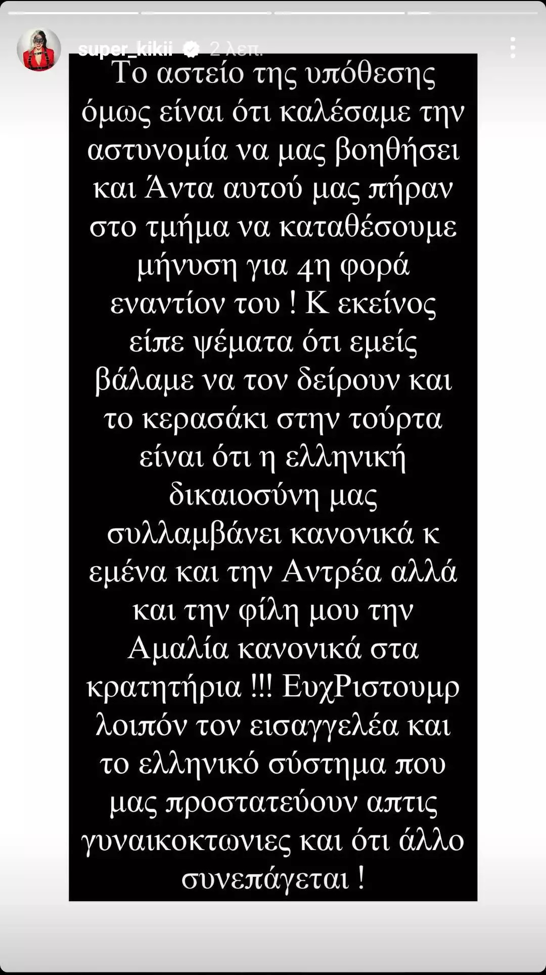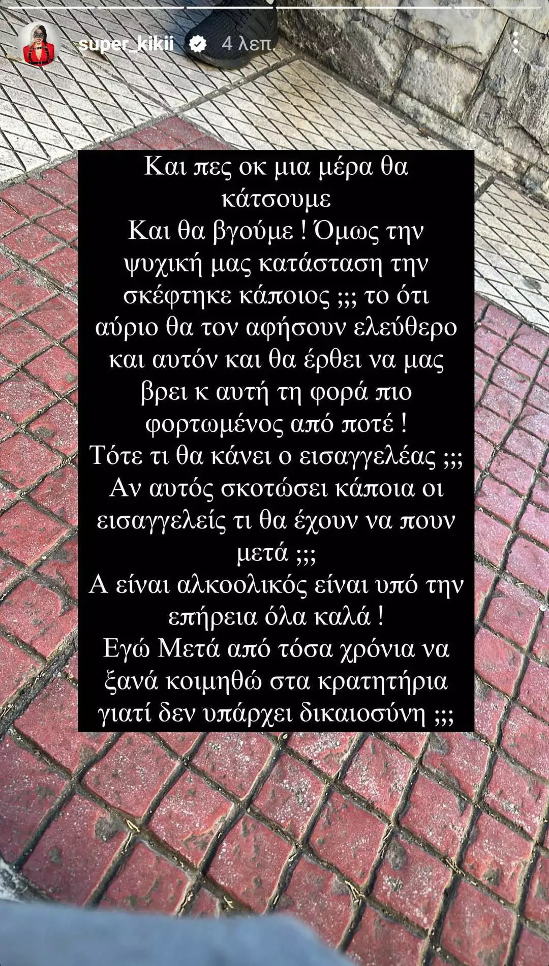 «Και πες ok, μία μέρα θα κάτσουμε και μετά θα βγούμε! Όμως την ψυχική μας κατάσταση την σκέφτηκε κάποιος; Το ότι αύριο θα τον αφήσουν ελεύθερο και αυτόν και θα έρθει να μας βρει και αυτή τη φορά πιο φορτωμένος από ποτέ! Τότε τι θα κάνει ο Εισαγγελέας; Αν αυτός σκοτώσει κάποια οι εισαγγελείς τι θα έχουν να πουν μετά; Είναι αλκοολικός, είναι από την επήρεια, όλα καλά! Εγώ μετά από τόσα χρόνια να ξανακοιμηθώ στα κρατητήρια γιατί δεν υπάρχει δικαιοσύνη;;;» έγραψε η Super Κική.