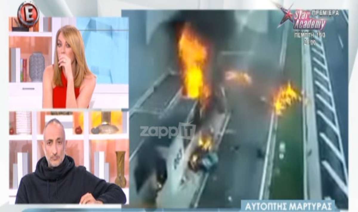 Ξαφνικά αρχίζουν να φεύγουν κομμάτια από τα λάστιχα του. Για αυτό έφυγε το αυτοκίνητο. Η εθνική οδός είχε απάνω κομμάτια, εγώ για να τα αποφύγω έστριψα λίγο να να αποφύγω τα κομμάτια που έφυγαν. Δηλαδή από λάστιχο την έπαθε ο άνθρωπος, και έχασε τον έλεγχο, φρενάρισε, κάπνιζαν τα λάστιχα του αυτοκινήτου πάνω στην άσφαλτο από το φρενάρισμα και μετά καρφώθηκε το αυτοκίνητο. Και τα κομμάτια έμειναν πάνω στην άσφαλτο. Απορώ πως η Τροχαία δεν τα είδε» αναφέρει ως προσωπική του εκτίμηση μάρτυρας στην εκπομπή Tatiana Live.
