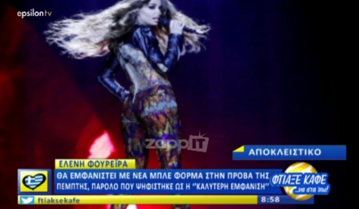 Αλλαγές επί σκηνής Eurovision 2018 για την Ελένη Φουρέιρα. Μία εξ αυτών, όπως ανέφεραν στην εκπομπή Φτιάξε καφέ να στα πω έχει να κάνει με το ρούχο. Έχουν ραφτεί 4 ρούχα επί δύο σύνολο οκτώ για την Ελένη. Στην αυριανή πρόβα, λοιπόν, η τραγουδίστρια φαίνεται πως θα επιλέξει ολόσωμη φόρμα μπλε χρώματος για να βγει στη σκηνή.