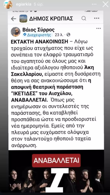 «Έκτακτη ανακοίνωση – Λόγω τροχαίου ατυχήματος που είχε ως συνέπεια τον ελαφρύ τραυματισμό του αγαπητού σε όλους μας και ιδιαίτερα αξιόλογου ηθοποιού Άκη Σακελλαρίου, είμαστε στη δυσάρεστη θέση να σας ανακοινώσουμε ότι η αποψινή θεατρική παράσταση “Ικέτιδες” του Αισχύλου, Αναβάλλεται.