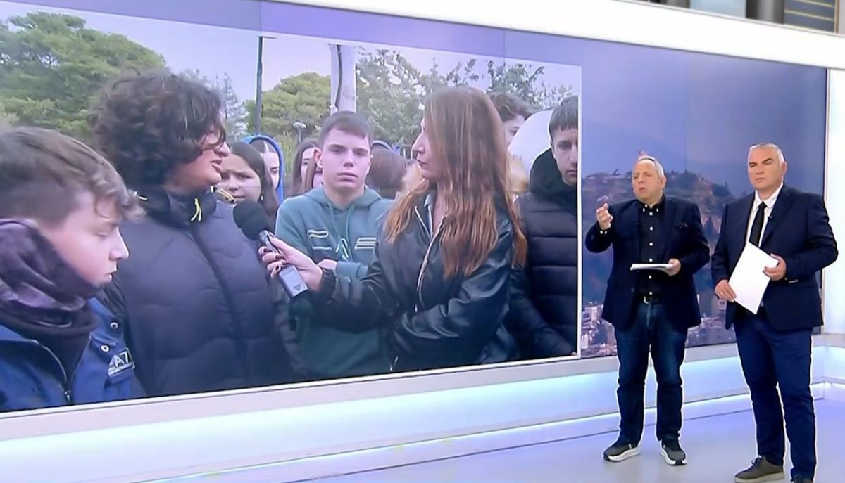«Μισό λεπτό, διέκοψε το παιδί. Το παιδάκι που είναι πίσω με το καπελάκι το παρακαλούμε πολύ να μην κάνει αυτές τις χειρονομίες. Προσπαθούμε να αναδείξουμε το πρόβλημά τους, δεν υπάρχει κανένας λόγος να γίνεται αυτό», παρατήρησε ευγενικά ο παρουσιαστής του ΣΚΑΪ, με τον νεαρό τελικά να συμμορφώνεται με τις υποδείξεις.