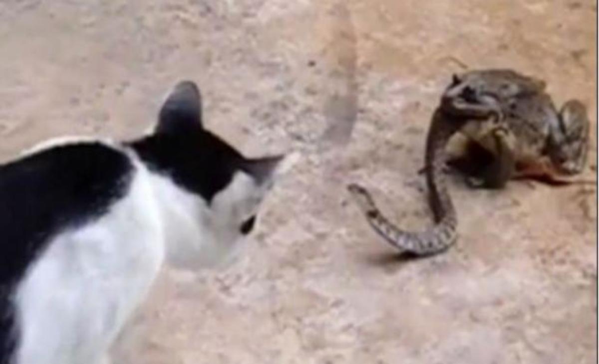 Όπως θα δείτε και εσείς, ο τεράστιος φρύνος έχει καταπιεί το μισό φίδι. Στο πλάνο, όμως, εμφανίζεται και μια γάτα, η οποία προσπαθεί να αντιμετωπίσει το ερπετό. Η γάτα απλώνει το μπροστινό της πόδι, ενώ το φίδι βγάζει έξω την διχαλωτή του γλώσσα…