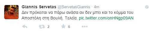 Λίγη ώρα μετά την ανακοίνωση των exit poll όπου έγινε γνωστό ποια κόμματα φαίνεται να μονομαχούν και ποια να μένουν εκτός της Βουλής, ο Γιάννης Σερβετάς με το γνωστό και έυστοχο χιούμορ του έκανε το δικό του σχόλιο στα social media.