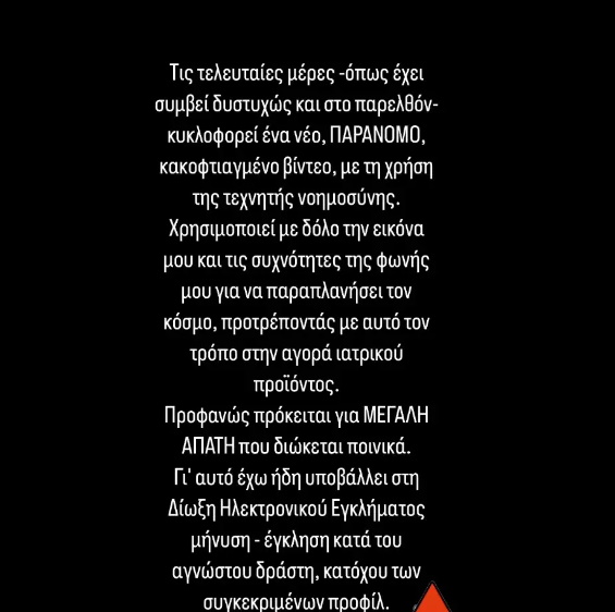 «Τις τελευταίες ημέρες -όπως έχει συμβεί δυστυχώς και στο παρελθόν- κυκλοφορεί ένα νέο, ΠΑΡΑΝΟΜΟ, κακοφτιαγμένο βίντεο με τη χρήση της τεχνητής νοημοσύνης. Χρησιμοποιεί με δόλο την εικόνα μου και τις συχνότητες της φωνής μου για να παραπλανήσει τον κόσμο προτρέποντας με αυτόν τον τρόπο στην αγορά ιατρικού προϊόντος.