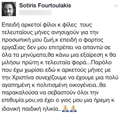 Tι έγραψε στο facebook ο Σωτήρης Φουρτουλάκης...