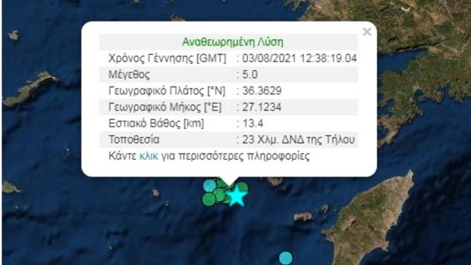Σύμφωνα με το Γεωδυναμικό Ινστιτούτο η δόνηση είχε μέγεθος 5 βαθμούς της κλίμακας Ρίχτερ, εστιακό βάθος 13,4 χιλιόμετρα και η εστία της εντοπίζεται 23 χιλιόμετρα Δυτικά-Νοτιοδυτικά της Τήλου.