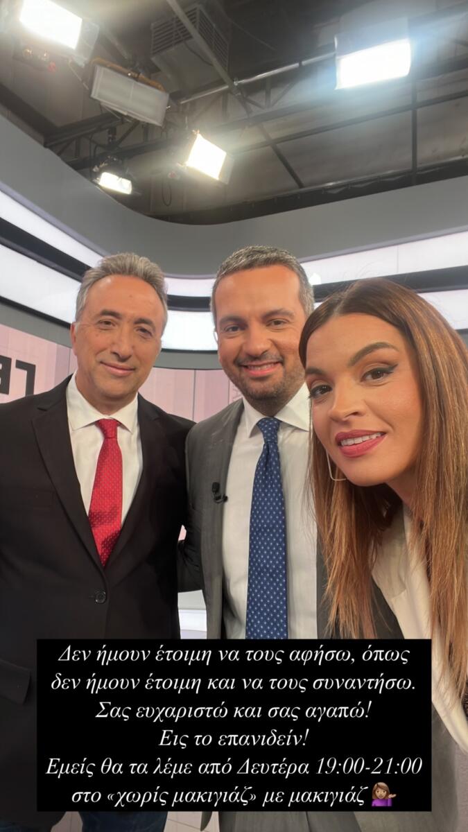 “Δεν ήμουν έτοιμη να τους αφήσω, όπως δεν ήμουν έτοιμη και να τους συναντήσω. Σας ευχαριστώ και σας αγαπώ! Εις το επανιδείν! Εμείς θα τα λέμε από Δευτέρα 19.00 – 21.00 στο “Χωρίς Μακιγιάζ” με μακιγιάζ” έγραψε, επίσης, η όμορφη δημοσιογράφος και παρουσιάστρια σε ιστορία που δημοσίευσε, πριν λίγες ώρες, στον προσωπικό της λογαριασμό στο Instagram.