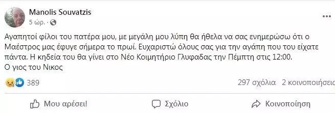 «Αγαπητοί φίλοι του πατέρα μου, με μεγάλη μου λύπη θα ήθελα να σας ενημερώσω ότι ο Μαέστρος μας έφυγε σήμερα το πρωί. Ευχαριστώ όλους σας για την αγάπη που του είχατε πάντα. Η κηδεία του θα γίνει στο Νέο Κοιμητήριο Γλυφάδας την Πέμπτη στις 21:00. Ο γιος του Νίκος» έγραψε.