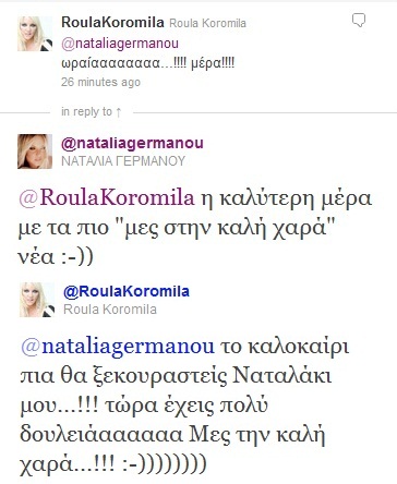 Όπως και να έχει η Ναταλία Γερμανού, η Έλενα Παπαβασιλείου, ο Θέμης Γεωργαντάς και η παρέα τους, αλλά και η Άση Μπήλιου, αναμένεται να περάσουν να υπογράψουν τις νέες τους συμβάσεις, που θα έχουν διάρκεια κάποιους μήνες, ως το τέλος της τηλεοπτικής σεζόν. Το…χαρμόσυνο γεγονός διεμήνυσαν και μέσω twitter και μάλιστα πανηγύρισαν τα καλά μαντάτα με τη Ρούλα Κορομηλά!