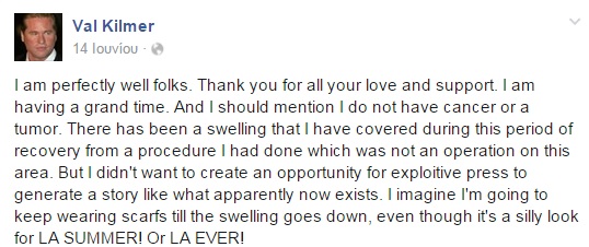 «Είμαι μια χαρά. Σας ευχαριστώ για την αγάπγ και την στήριξη. Περνάω τέλεια. Και πρέπει να σας αναφέρω ότι δεν έχω καρκίνο ή όγκο. Έχω ένα πρήξιμο λόγω της ανάρρωσης από μια διαδικασία, η οποία δεν ήταν επέμβαση σε αυτή την περιοχή. Αλλά δεν ήθελα να δώσω την ευκαιρία να γραφτούν δημοσιεύματα όπως έγινε τελικά. Φαντάζομαι να συνεχίσω να φοράω μαντήλια μέχρι να υποχωρήσει το πρήξιμο, παρόλο που δείχνει χαζό καλοκαιριάτικα στο LA ή γενικά στο LA.»