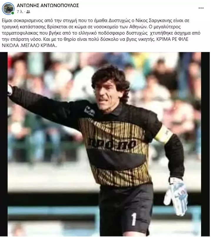 «Είμαι σοκαρισμένος από την στιγμή που το έμαθα. Δυστυχώς ο Νίκος Σαργκάνης είναι σε τραγική κατάσταση. Βρίσκεται σε κώμα σε νοσοκομείο των Αθηνών. Ο μεγαλύτερος τερματοφύλακας που βγήκε από το ελληνικό ποδόσφαιρο δυστυχώς χτυπήθηκε άσχημα από την επάρατη νόσο. Και με το θηρίο είναι πολύ δύσκολο να βγεις νικητής. Κρίμα ρε φίλε Νικόλα. Μεγάλο κρίμα», έγραψε ο δημοσιογράφος.