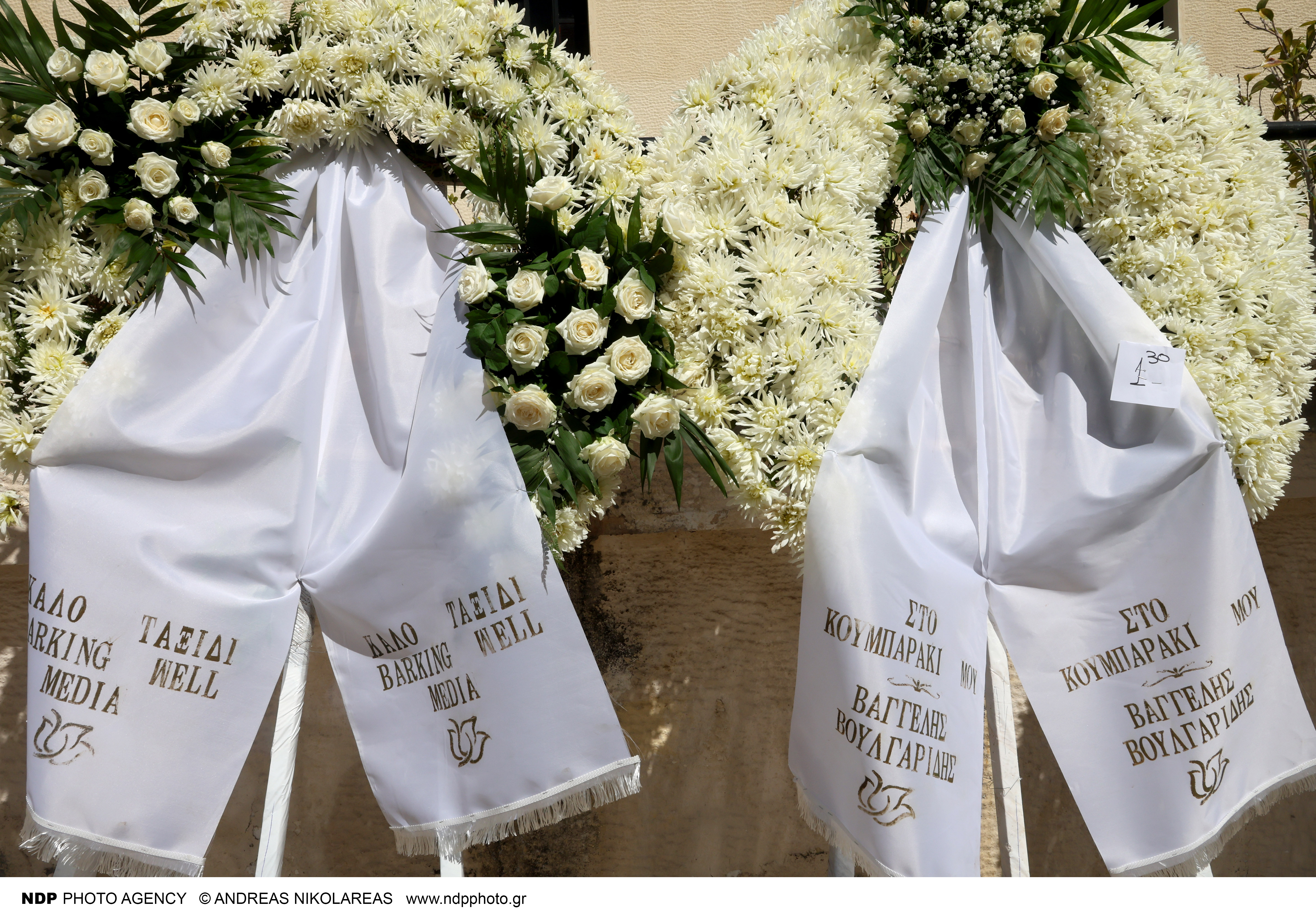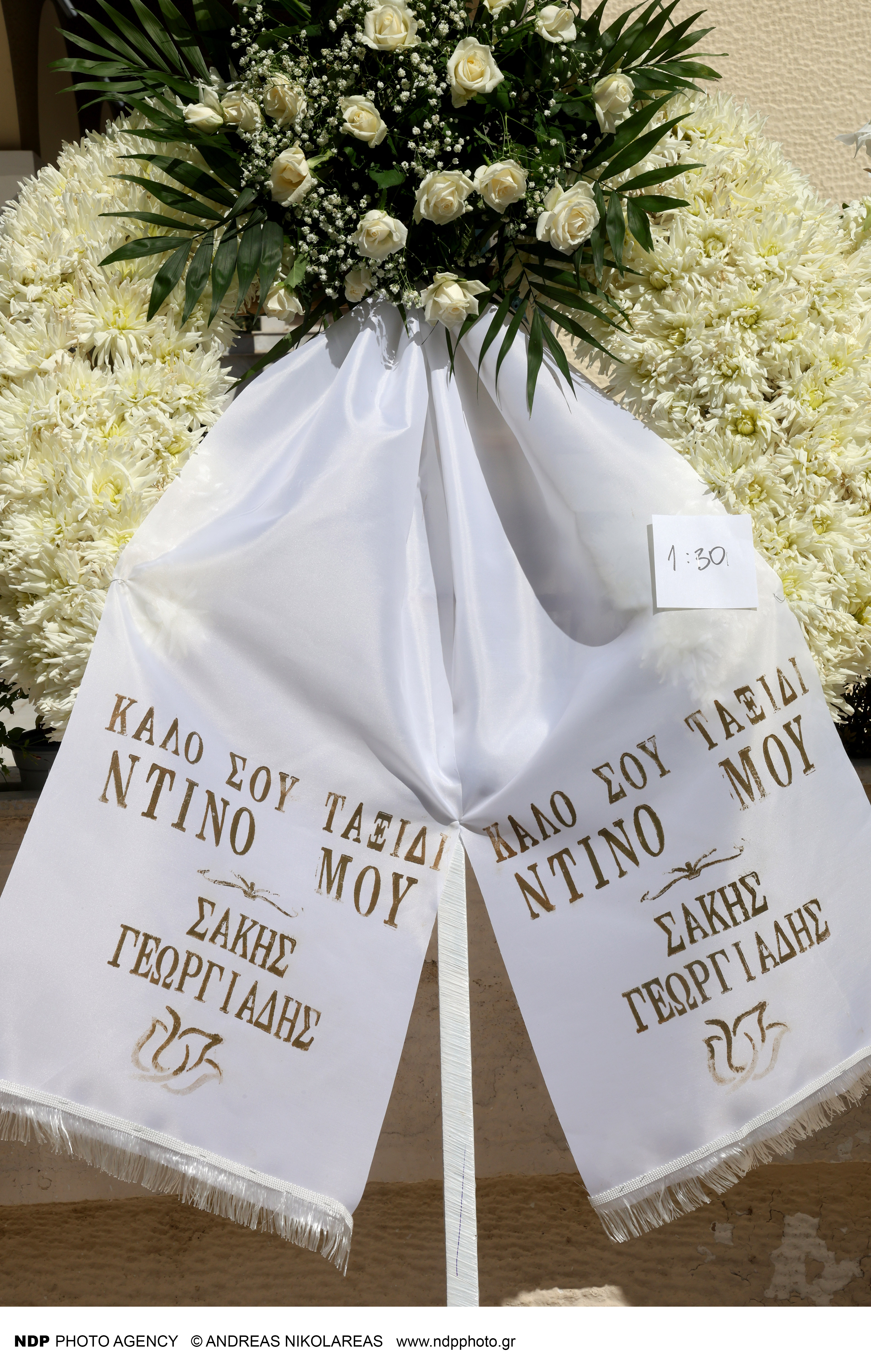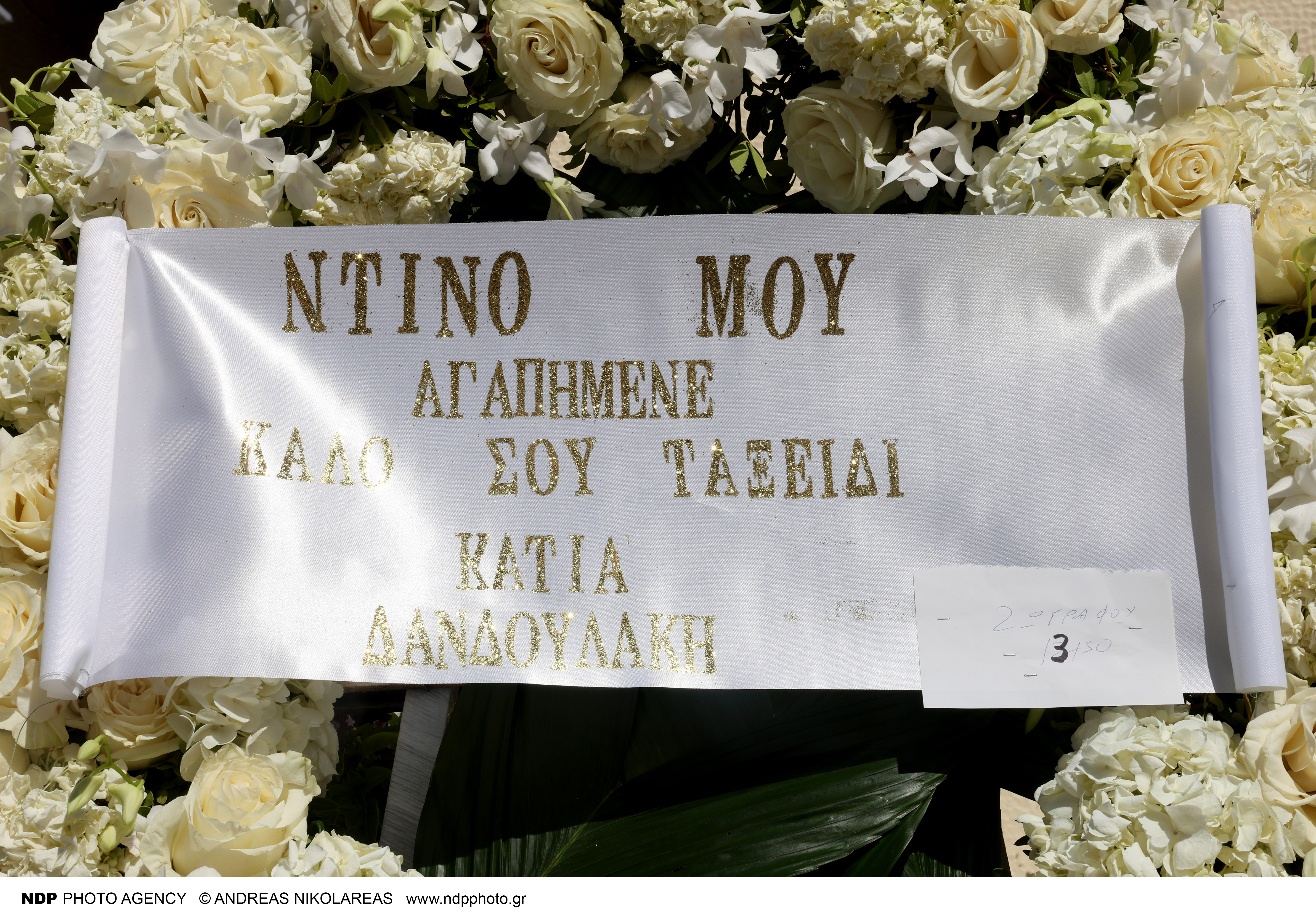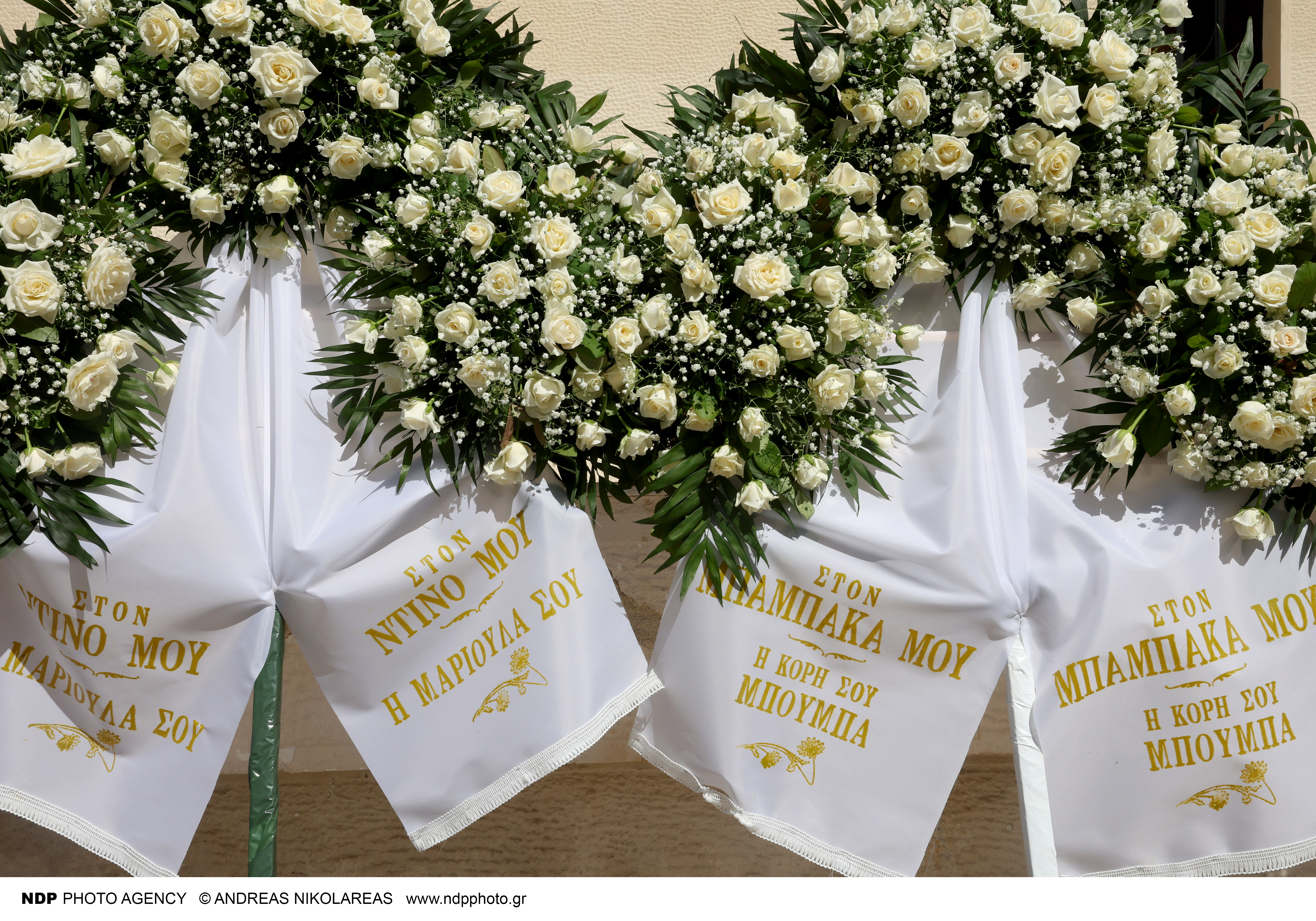 «Στον μπαμπάκα μου. Η κόρη σου, Μπούμπα», γράφει χαρακτηριστικά το στεφάνι της Σμαράγδας Καρύδη, η οποία τον αποχαιρετά με πόνο.