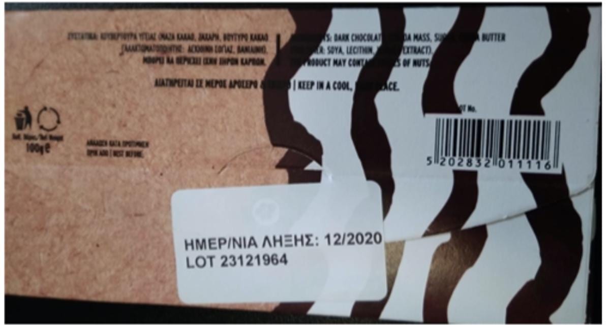 Πρόκειται για το προϊόν “Σοκολάτα υγείας ΠΟΛΥΧΩΡΟΣ ΓΕΥΣΕΩΝ ΧΡΥΣΟ” σε συσκευασία 100 γρ., με ημερομηνία ελάχιστης διατηρησιμότητας 12-2020.