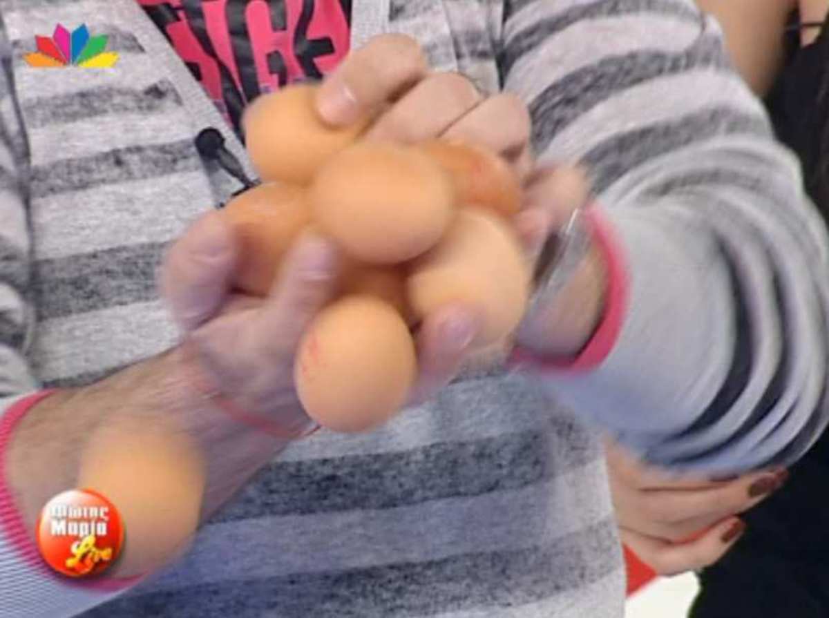 Προσπάθησαν να βάλουν όσα περισσότερα αυγά μπορούσαν στα χέρια του αλλά πριν καν προσπαθήσουν να περπατήσουν έπεσαν τα αυγά από τα χέρια τους και γέμισαν το στούντιο από κρόκους και ασπράδια.