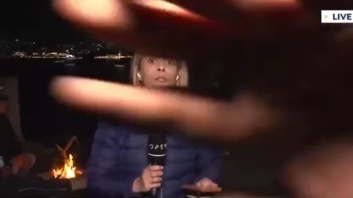 Η δημοσιογράφος βρισκόταν σε απευθείας σύνδεση με την Αθήνα και συνομιλούσε με την Εύα Αντωνοπούλου, όταν άντρας έβαλε το χέρι του μπροστά στον τηλεοπτικό φακό.