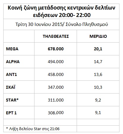Αλλά και στη ζώνη κοινής μετάδοσης (20.00-22.00) των κεντρικών δελτίων ειδήσεων, το δελτίο ειδήσεων του MEGA ήταν πρώτο, σημειώνοντας ποσοστό 20,1%, με τον ALPHA να ακολουθεί στη δεύτερη θέση με ποσοστό 14,7%.