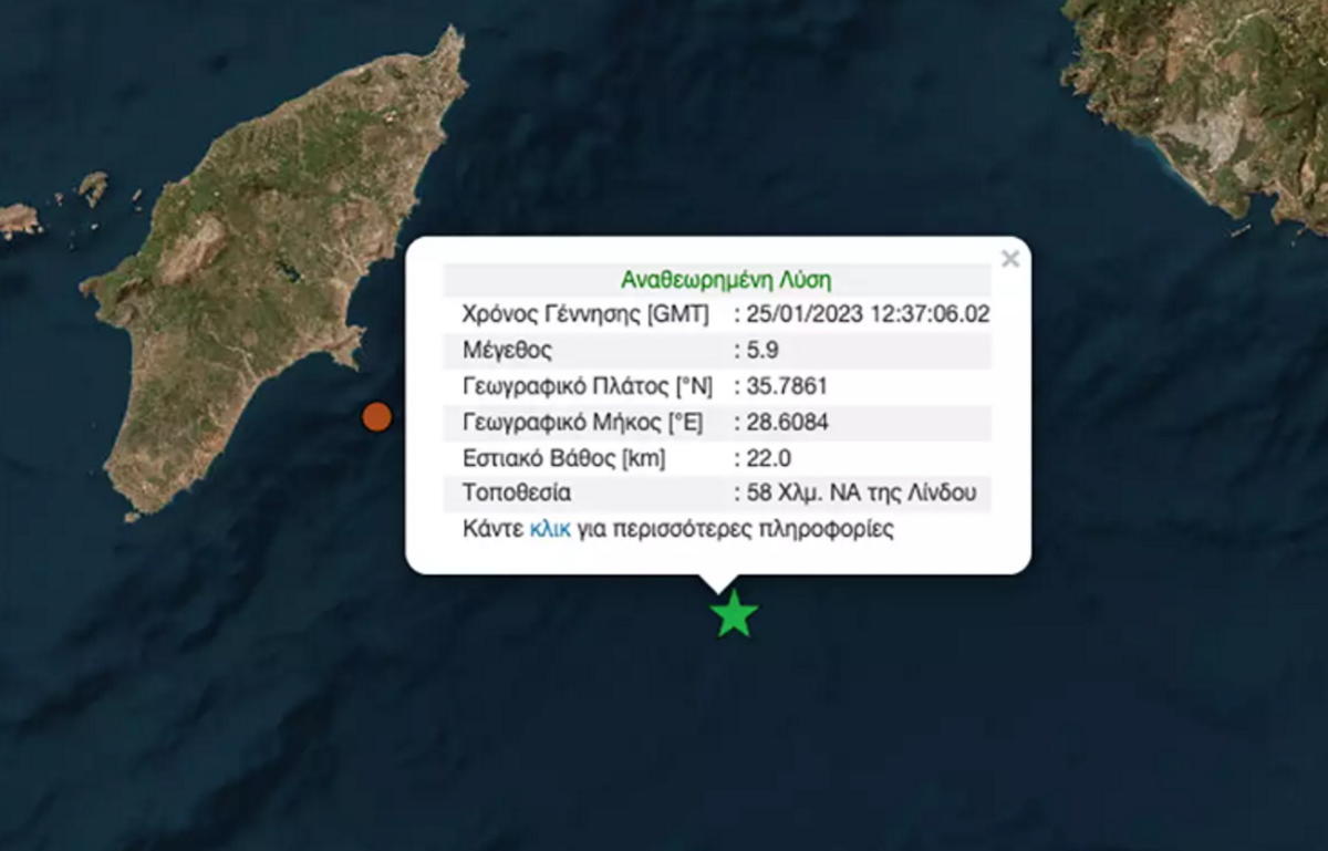 Ο σεισμός των 5,9 Ρίχτερ που ταρακούνησε την Ρόδο, σύμφωνα με τα στοιχεία από το Γεωδυναμικό Ινστιτούτο, σημειώθηκε στις 14:37 το μεσημέρι της Τετάρτης (25.01.2023), 58 χλμ νοτιοανατολικά της Λίνδου.