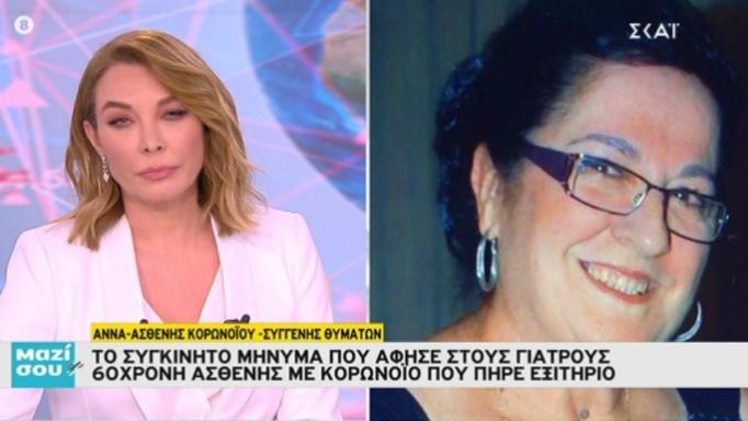 Μέσα από τηλεφωνική επικοινωνία με την Τατιάνα Στεφανίδου, το μεσημέρι του Σαββάτου στο “Μαζί σου“, η 60χρονη Άννα από την Δαμασκηνιά συγκίνησε το τηλεοπτικό κοινό με την ιστορία της. Η άτυχη γυναίκα έχασε τόσο τον αγαπημένο της σύζυγο όσο και τον πεθερό της από της έξαρση του κορονοϊού στη χώρα μας.