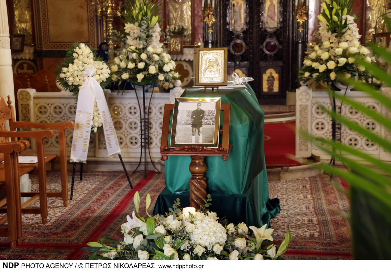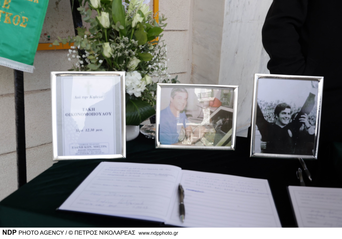 Ο Τάκης Οικονομόπουλος οδηγήθηκε στην τελευταία του κατοικία, με το φέρετρό του να είναι καλυμμένο με την σημαία του Παναθηναϊκού, όπως είχε γίνει κι στην περίπτωση του “Στρατηγού”, Μίμη Δομάζου.
