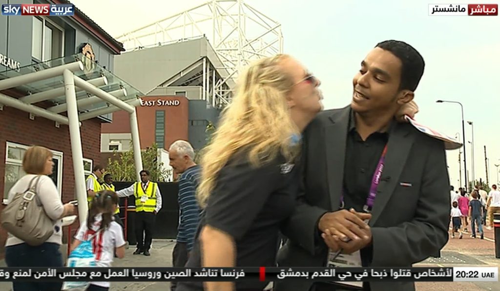Έκπληκτος έμεινε ο δημοσιογράφος του αραβικού sky NEWS όταν όρμησε πάνω του μια ξανθιά κοπέλα, τον πήρε αγκαλιά και του έδωσε ένα παθιασμένο φιλί στο μάγουλο!