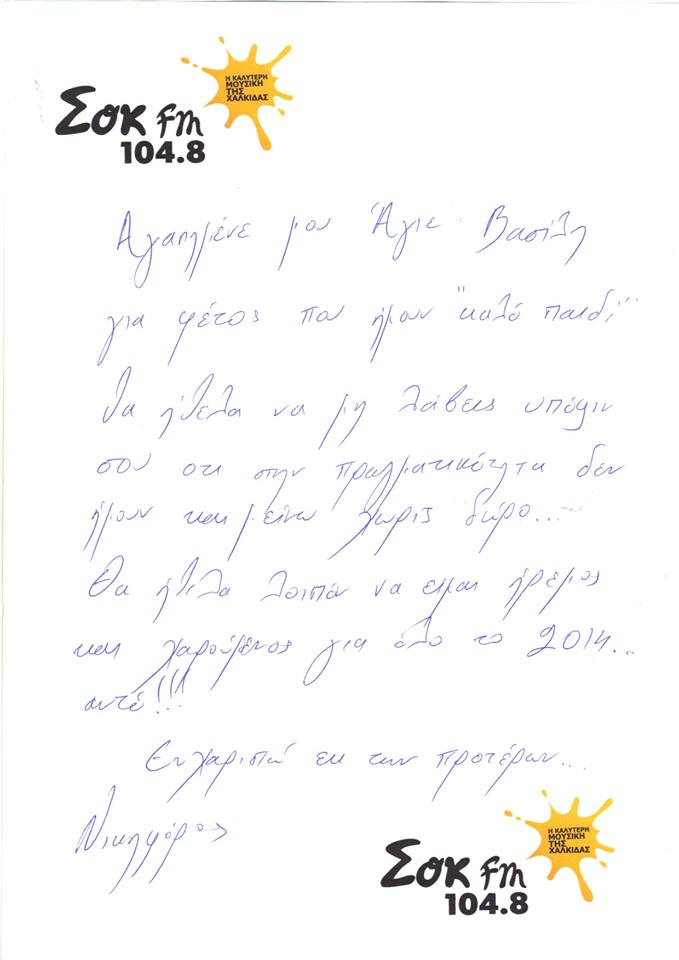 Οι αγαπημένοι καλλιτέχνες βρέθηκαν όλοι μαζί και έγραψε ο καθένας το δικό του γράμμα στον Άγιο Βασίλη! Ο Νικηφόρος, ο Χρήστος Χολίδης, ο Ηλίας Βρεττός, ο Θοδωρής Μαραντίνης και ο Άρης Λουμάκης ζήτησαν ο καθένας κάτι ξεχωριστό για το 2014…! Συναντήθηκαν στο μεγάλο Christmas night που διοργάνωσε ο ΣΟΚ fm στην Χαλκίδα και από την οποία πέρασε ολόκληρη η πόλη!