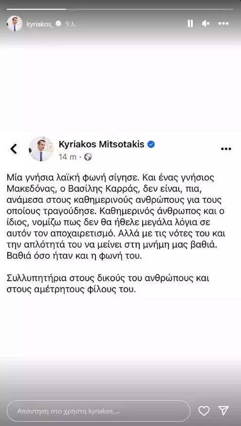 Παράλληα, και ο Κυριάκος Μητσοτάκης θέλησε να εκφράσει τη λύπη του για το τραγικό γεγονός, μαθαίνοντας πως ο Βασίλης Καρράς δεν βρίσκεται πια στη ζωή. Ο πρωθυπουργός έγραψε ένα αποχαιρετιστήριο μήνυμα μέσω Instagram.