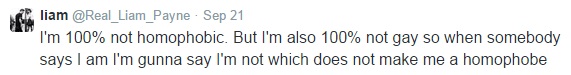 Το μέλος του διάσημου συγκροτήματος “One Direction”, έγραψε: «Δεν είναι δυνατόν να πιστεύει ο κόσμος πως εγώ απεικονίζομαι σε αυτές τις φώτο. Δεν είμαι ομοφοβικός 100%, και επίσης δεν είμαι gay 100%! Το ότι λέω πως δεν είμαι ομοφυλόφιλος, δεν σημαίνει πως είμαι και ομοφοβικός!»