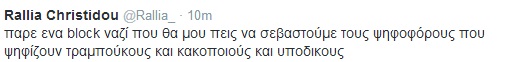 Το tweet της τραγουδίστριας Ραλλίας Χρηστίδου «πόση καφρίλα πια;;; ντρέπομαι για κάποια ποσοστά στο δήμο Αθηναίων και στην περιφέρεια Αττικής τραμπούκους και υποκοσμο» πυροδότησε μια σειρά από απαντήσεις – διαμαρτυρίας στο προφίλ της από πρόσωπο που την ακολουθεί.