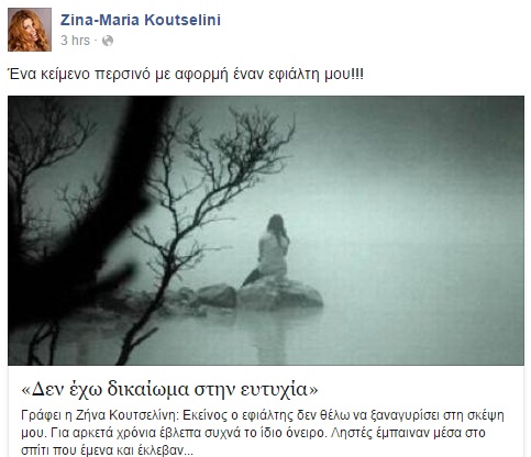 «Ένα κείμενο περσινό με αφορμή έναν εφιάλτη μου!!!», έγραψε στο facebook και ανάρτησε το κείμενο από το entertv με τίτλο «Δεν έχω δικαίωμα στην ευτυχία»;