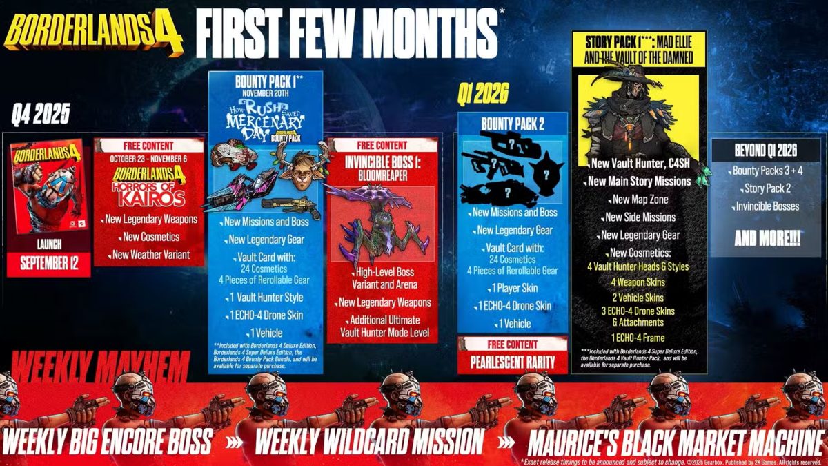 Η Gearbox και η 2K αποκάλυψαν τα πρώτα στοιχεία για το μετα-κυκλοφοριακό πλάνο του Borderlands 4, το οποίο φαίνεται πιο φιλόδοξο από ποτέ. Το παιχνίδι αναμένεται να παραμείνει ενεργό καθ’ όλη τη διάρκεια του 2025, με συνδυασμό δωρεάν ενημερώσεων και DLC που θα εμπλουτίζουν τον κόσμο του Kairos με νέα γεγονότα, bosses και loot.