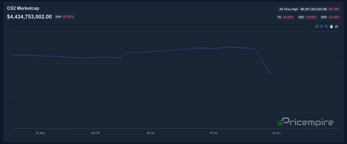 Η συνολική αποτίμηση του CS2 skin market έπεσε από τα 5,9 δισ. δολάρια στα 4,2 δισ., πριν αρχίσει ελαφρώς να ανακάμπτει στα 4,4 δισ., σύμφωνα με τα στοιχεία των Price Empire και FloatDB.