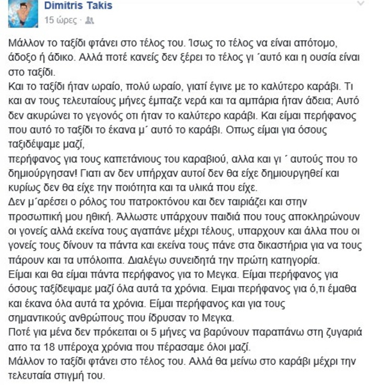 Είμαι και θα είμαι πάντα περήφανος για το Μέγκα. Είμαι περήφανος για όσους ταξιδέψαμε μαζί όλα αυτά τα χρόνια. Είμαι περήφανος για ό,τι έμαθα και έκανα όλα αυτά τα χρόνια. Είμαι περήφανος και για τους σημαντικούς ανθρώπους που ίδρυσαν το Μέγκα.