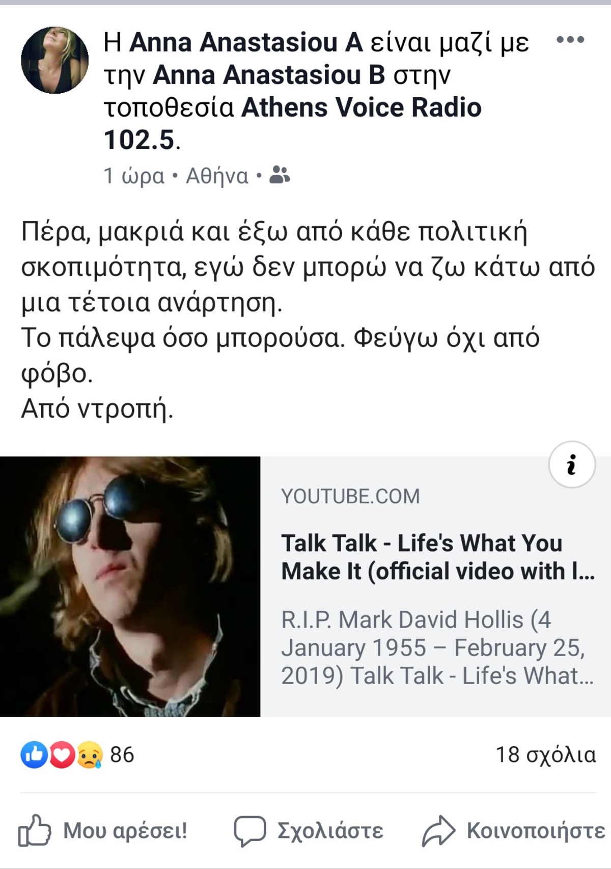 Η ραδιοφωνική παραγωγός του Athens Voice 102.5, Άννα Αναστασίου, υπέβαλε την παραίτησή της. Όπως διευκρίνισε η ίδια, έδωσε τέλος στην συνεργασία της με τον σταθμό μετά την ντροπιαστική ανάρτηση της Athens Voice για τον θάνατο μετανάστριας – αποκλειστικής νοσοκόμας στο Γενικό Κρατικό Νίκαιας.