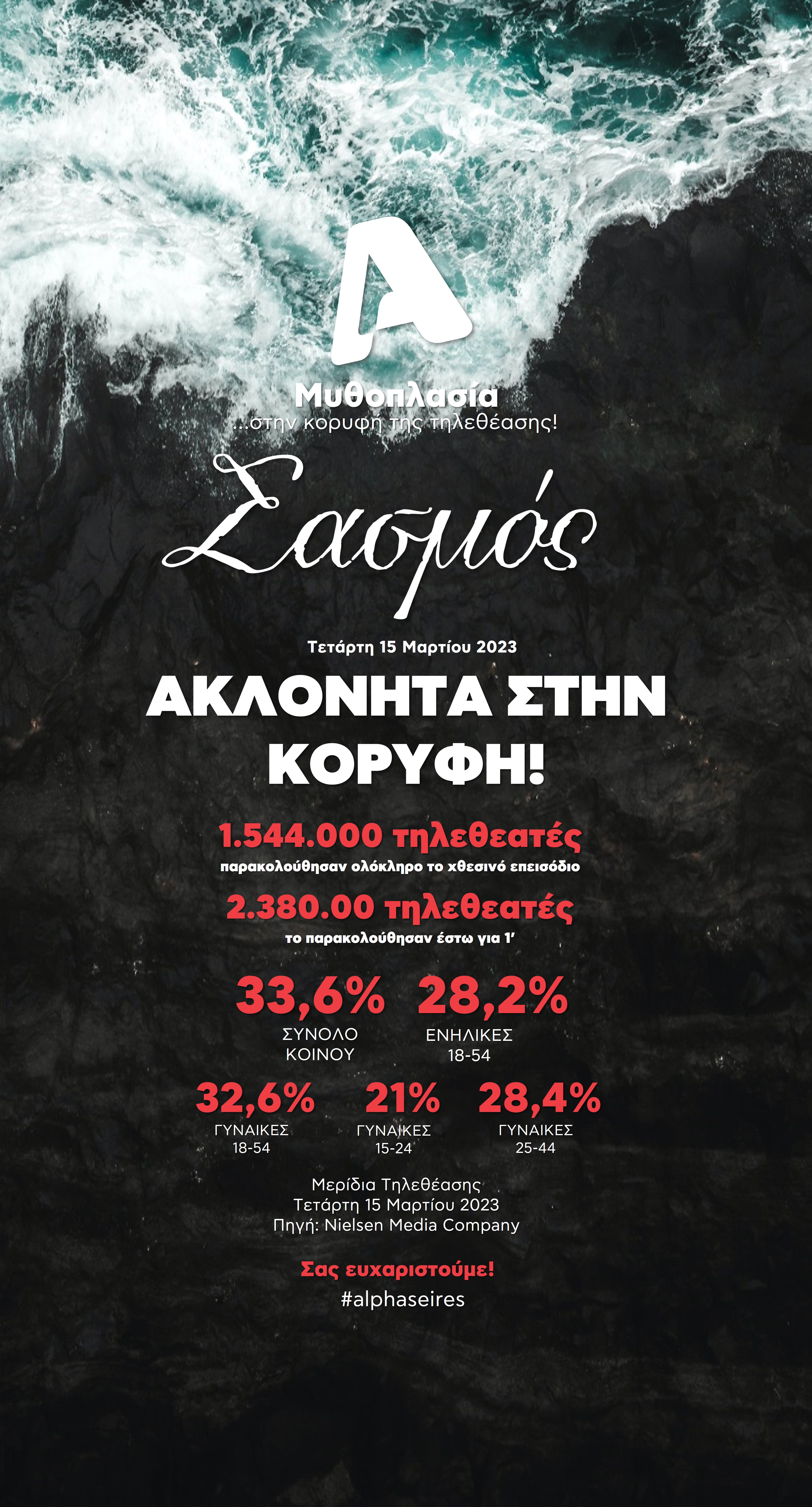 Τέλος, στο top 20 των τηλεοπτικών προγραμμάτων την εβδομάδα 06-12 Μαρτίου 2023, ο ALPHA κατέκτησε τις 10 θέσεις με τις σειρές μυθοπλασίας του: 6 θέσεις ο «Σασμός» (στην πρώτη δεκάδα) και 4 θέσεις ο «Παράδεισος των κυριών».