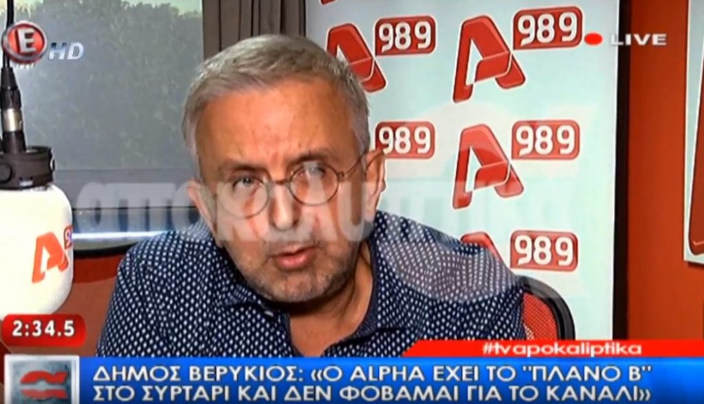 Συνέντευξη στην εκπομπή Αποκαλυπτικά έδωσε ο Δήμος Βερύκιος. Ο δημοσιογράφος μίλησε για τα αποτελέσματα της δημοπρασίας των τηλεοπτικών αδειών, το plan B του Alpha και δήλωσε πως από τον Alpha θα φύγει τελευταίος.