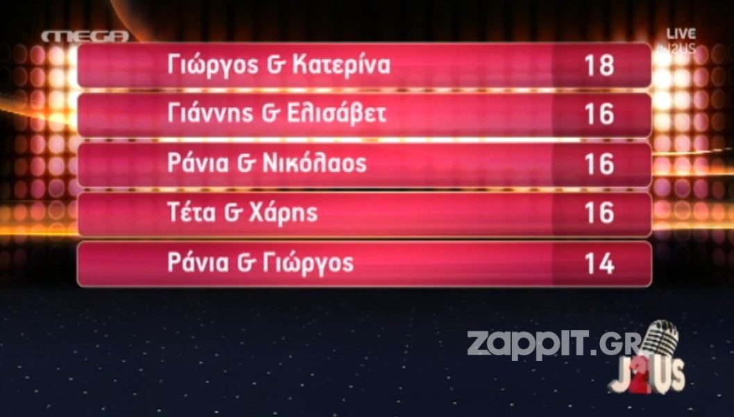 Η Ράνια Κωστάκη και ο Γιώργος Γιαννιάς ανεβαίνουν στη σκηνή του J2US με το τραγούδι του Γιώργου Θεοφάνους «Κόκκινη Γραμμή» και δυσκολεύουν τον κριτή που δηλώνει πως δύσκολα μπορεί να το απολαύσει από άλλη φωνή εκτός της Νατάσας Θεοδωρίδου. Τελικά συγκεντρώνουν την χαμηλότερη βαθμολογία μέχρι στιγμής…14!22:36 Η Τέτα Καμπουρέλη και ο Χάρης Βαρθακούρης τραγουδούν για «Καλοκαιρινά Ραντεβού» και συγκεντρώνουν μόλις 16 βαθμούς μετά το 4 του Γιώργου Θεοφάνους…