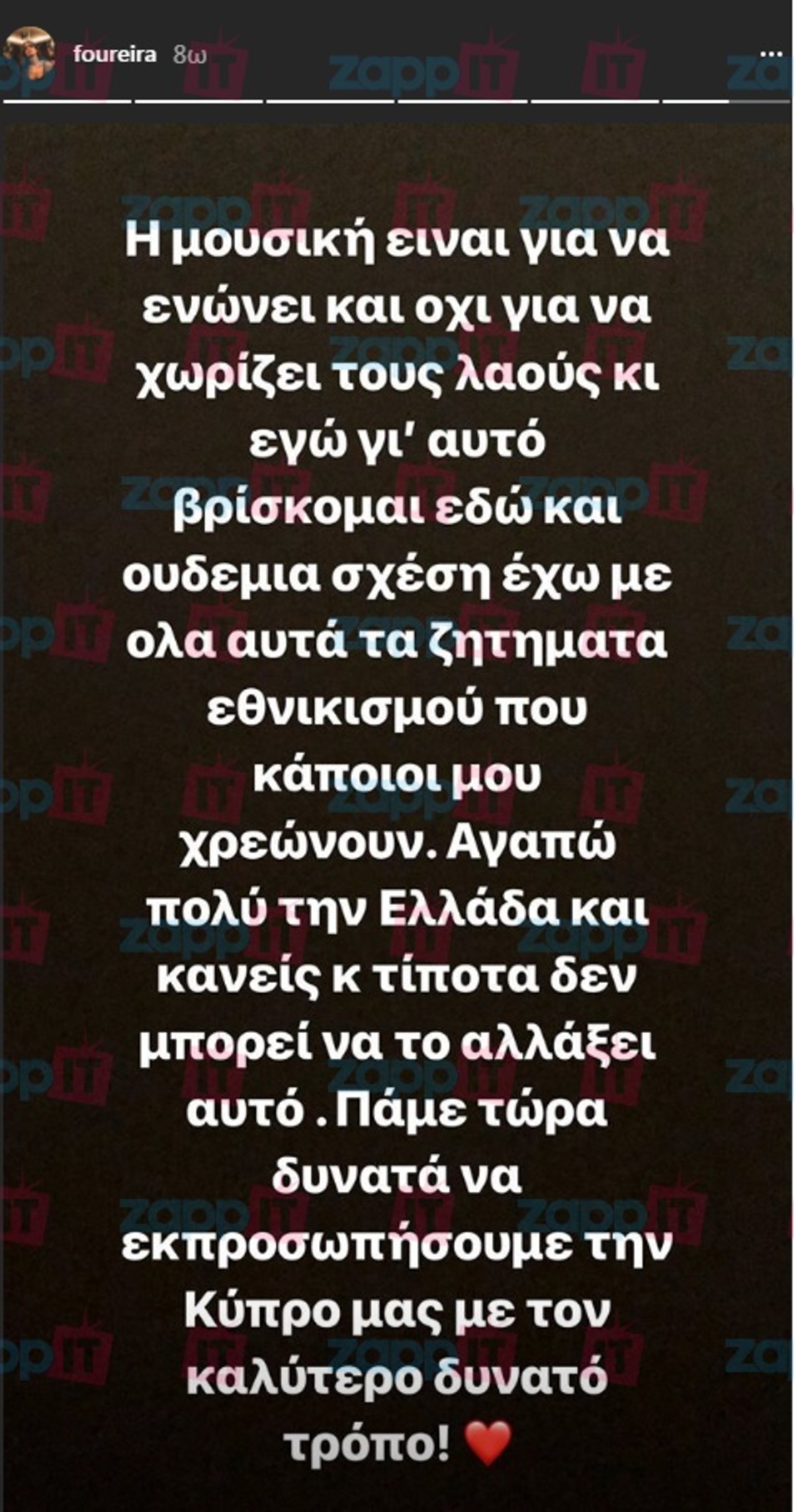 Μέσα από τον λογαριασμό της στο Instagram, η Ελένη Φουρέιρα απάντησε ως εξής: “Η μουσική είναι για να ενώνει και όχι για να χωρίζει τους λαούς κι εγώ γι’ αυτό βρίσκομαι εδώ και ουδεμία σχέση έχω με όλα αυτά τα ζητήματα εθνικισμού που κάποιοι μου χρεώνουν. Αγαπώ πολύ την Ελλάδα και κανείς και τίποτα δεν μπορεί να το αλλάξει αυτό. Πάμε τώρα δυνατά να εκπροσωπήσουμε την Κύπρο μας με τον καλύτερο δυνατό τρόπο”.