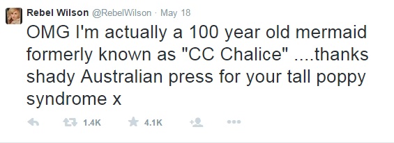 Μετά την έκταση που πήρε το θέμα, η ηθοποιός απάντησε με ένα της tweet αστειευόμενη με το δημοσίευμα «Είμαι μια γοργόνα 100 χρονών και το πραγματικό μου όνομα είναι CC Chalize».