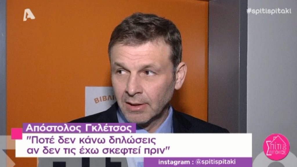 Στο μικρόφωνο της εκπομπής “Σπίτι μου σπιτάκι μου” μίλησε ο Απόστολος Γκλέτσος, λίγες μέρες μετά την αποκάλυψή του ότι έχει πάει με άντρα. Ο δήμαρχος Στυλίδας σημείωσε πως: «Δεν είμαστε ρατσιστές από κακία, είμαστε ρατσιστές από ανασφάλεια. Πρέπει να βοηθάμε τα παιδιά από μικρά να τελειώνουν με κάτι τέτοια θέματα. Είναι πολύ βασικό να περνά ο έφηβος την εφηβεία του ξεφορτωμένος από έναν σωρό κόμπλεξ που δεν τα έχει ανάγκη».