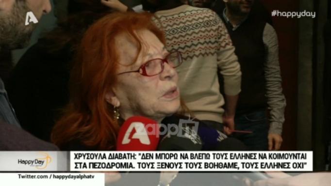 Η Χρυσούλα Διαβάτη εξέφρασε την άποψή της για τους Έλληνες που κοιμούνται στα πεζοδρόμια, κάνοντας παράλληλα σύγκριση με τους μετανάστες και τη βοήθεια που δέχονται. Η Χρυσούλα Διαβάτη δήλωσε τα εξής: