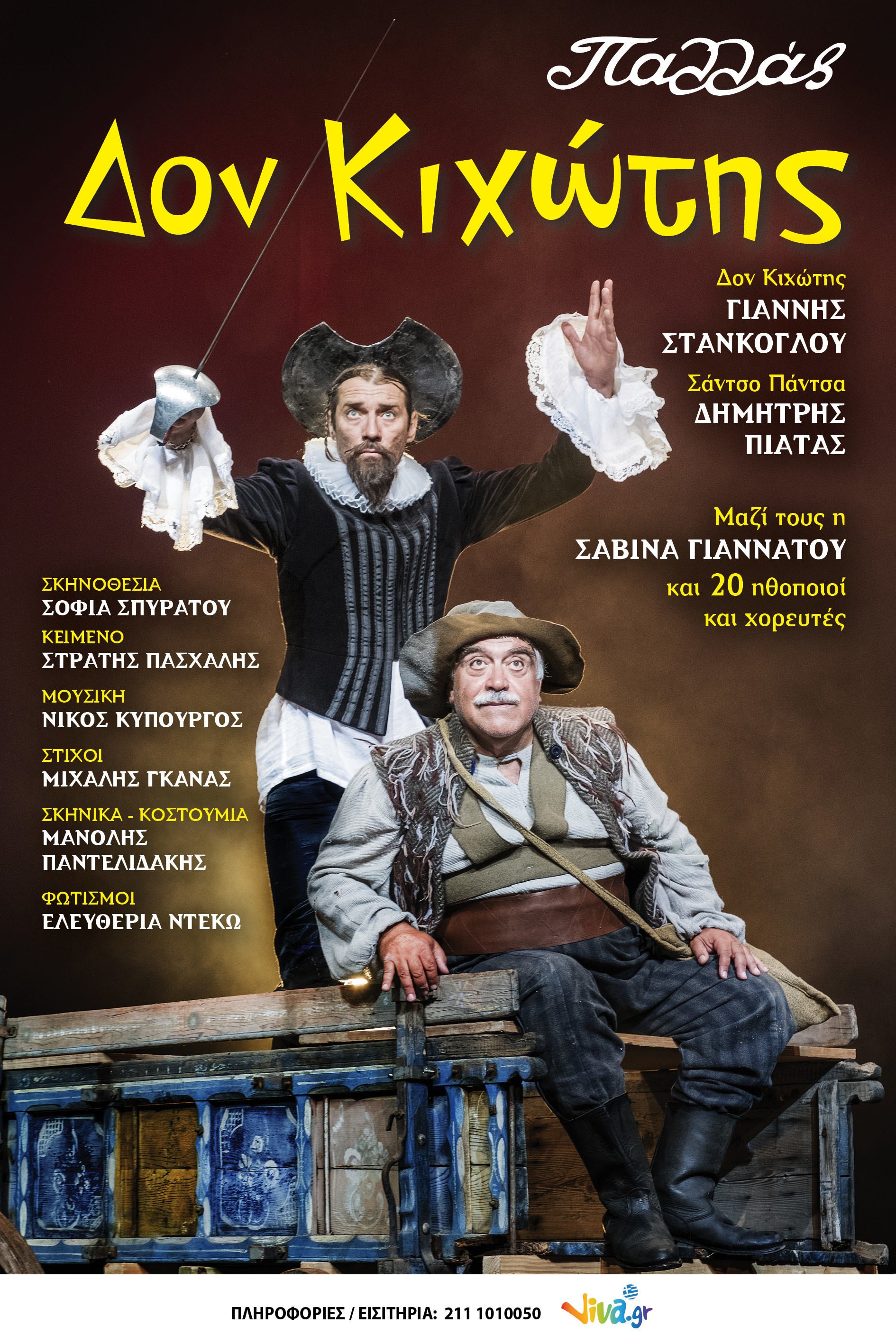 Με τον Γιάννη Στάνκογλου ως Δον Κιχώτη, με τον Δημήτρη Πιατά στον ρόλο του Σάντσο Πάντσα κι έναν εικοσαμελή θίασο από ταλαντούχους ηθοποιούς, χορευτές και ακροβάτες, η παράσταση ζωντανεύει τις συναρπαστικές περιπέτειες του «μεγαλοφάνταστου ιδαλγού» σε σκηνοθεσία και χορογραφία της Σοφίας Σπυράτου, δημιουργού μερικών από τις πιο επιτυχημένες παιδικές παραστάσεις των τελευταίων ετών, όπως Ο Θησέας και η Αριάδνη στο νησί των ταύρων και Ο Ιάσονας και το χρυσόμαλλο δέρας. Το κείμενο του βραβευμένου ποιητή Στρατή Πασχάλη, που διασκεύασε το μυθιστόρημα του Θερβάντες με σεβασμό στις ιδέες και την πλοκή του, εξιστορεί το μαγικό ταξίδι του Κιχώτη μπολιάζοντάς το με στοιχεία από την commedia del’arte και το θέατρο του δρόμου, συνδέοντας τον ρομαντικό μύθο του περιπλανώμενου ιππότη με το σήμερα.