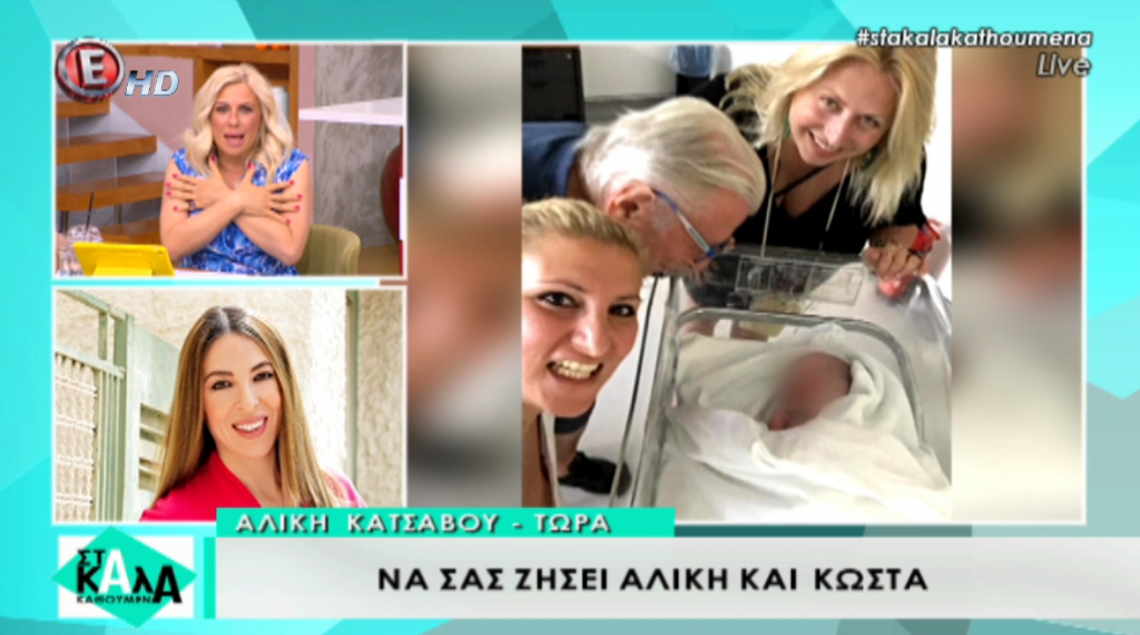 «Είμαι δυνατή, γερή. Είμαι τρισευτυχισμένη γιατί τον έχω στο δωμάτιο μαζί μου τον Φοίβο. Τώρα τον έχω δώσει στην αγκαλιά του Κώστα για να μιλήσω εγώ μαζί σας. Την ώρα που τον σήκωσαν ψηλά και τον είδα και άλλαζε χέρια μέχρι να έρθει στην αγκαλιά μου, αυτά τα δευτερόλεπτα είναι συγκλονιστικά», ανέφερε χαρακτηριστικά η Αλίκη Κατσαβού και η Κατερίνα Καραβάτου έβαλε τα κλάματα. «Είναι πολύ ήρεμος, γλυκός και ήσυχος και έχει ένα μικρό παραπονάκι όταν πεινάσει. Ο Κώστας έβαλε τα κλάματα. Όλοι λένε ότι μοιάζει στον Κώστα, εγώ νομίζω ότι μου μοιάζει και μένα λίγο. Γεννήθηκε 3.330 γραμμάρια και 52 εκατοστά ύψος», πρόσθεσε.