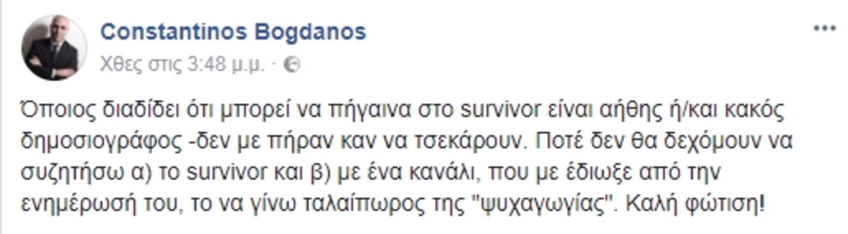 «Όποιος διαδίδει ότι μπορεί να πήγαινα στο Survivor είναι αήθης ή/και κακός δημοσιογράφος -δεν με πήραν καν να τσεκάρουν. Ποτέ δεν θα δεχόμουν να συζητήσω α) το Survivor και β) με ένα κανάλι, που με έδιωξε από την ενημέρωσή του, το να γίνω ταλαίπωρος της “ψυχαγωγίας”. Καλή φώτιση!», ανέφερε συγκεκριμένα ο Κωνσταντίνος Μπογδάνος.