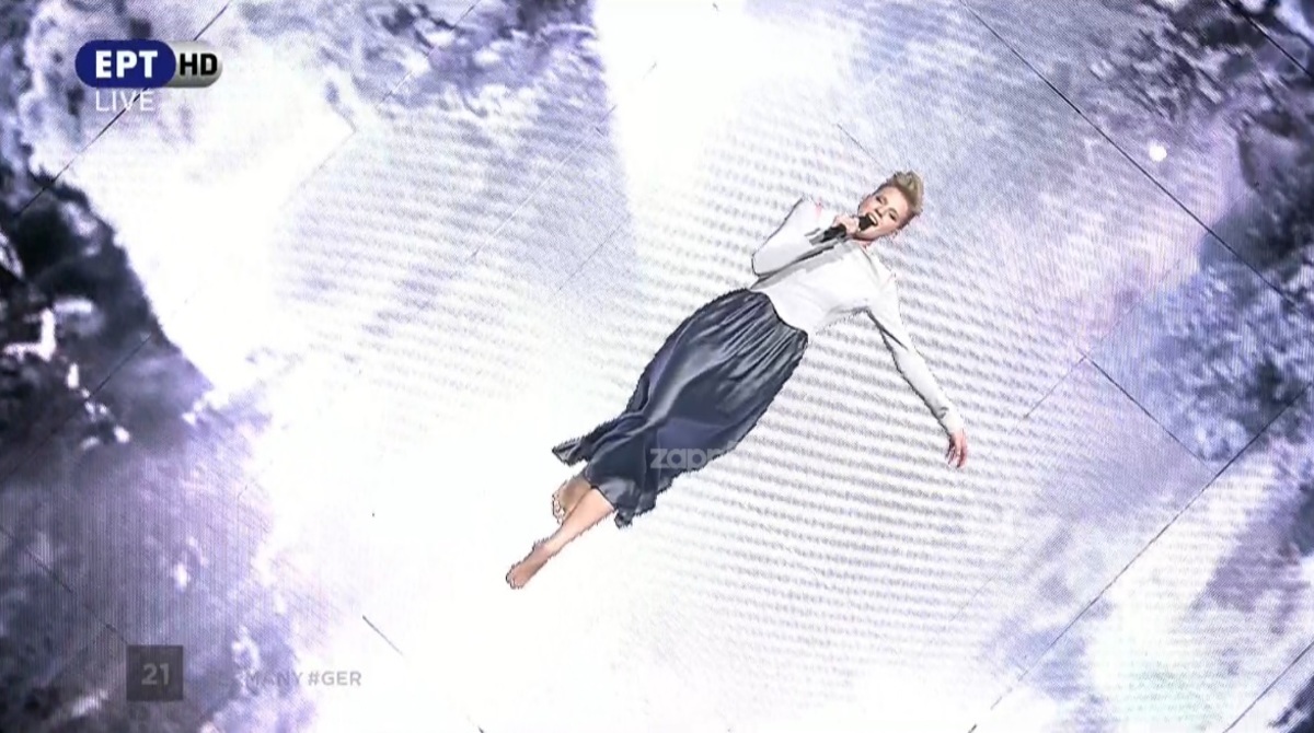 23:12 Ώρα για την Ελλάδα μας και τη μοναδική Demy που ανεβαίνει στη σκηνή της Eurovision 2017 και μαγεύει με την παρουσία της και τα ειδικά εφέ που έχει επιμεληθεί ο Φωκάς Ευαγγελινός. Συγκριτικά με την εμφάνισή της στον ημιτελικό, διαπιστώνουμε ότι έχουν γίνει σημαντικές σκηνοθετικές διορθώσεις που επιτρέπουν αυτή τη φορά να καταλάβουμε καλύτερα όσα αφηγείται το τραγούδι και κυρίως να δούμε -γιατί την προηγούμενη φορά δεν είδαμε- το γραφικό που κινείται στο ειδικό γυαλί.