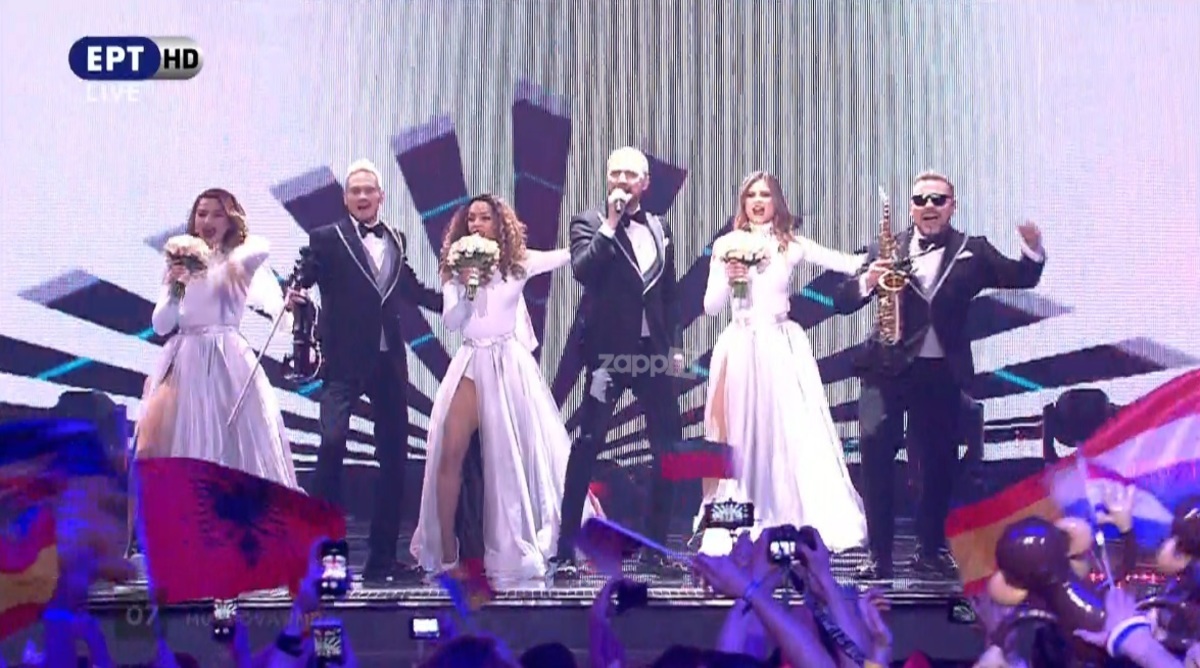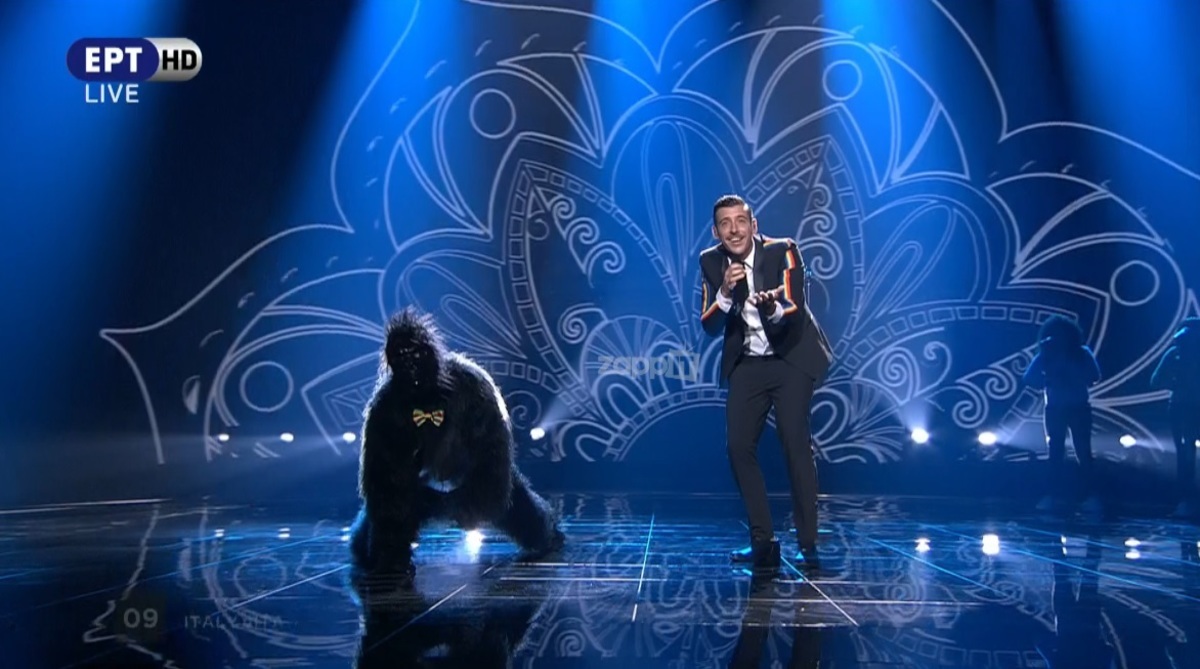 22:45 Ώρα για την Ιταλία που τα στοιχήματα την θέλουν το απόλυτο φαβορί. Ο Francesco Gabbani και ο γορίλας του τραγουδούν και χορεύουν στον ρυθμό του Occidentali’s Karma. Το κοινό ξεσηκώνεται από το πρώτο λεπτό.