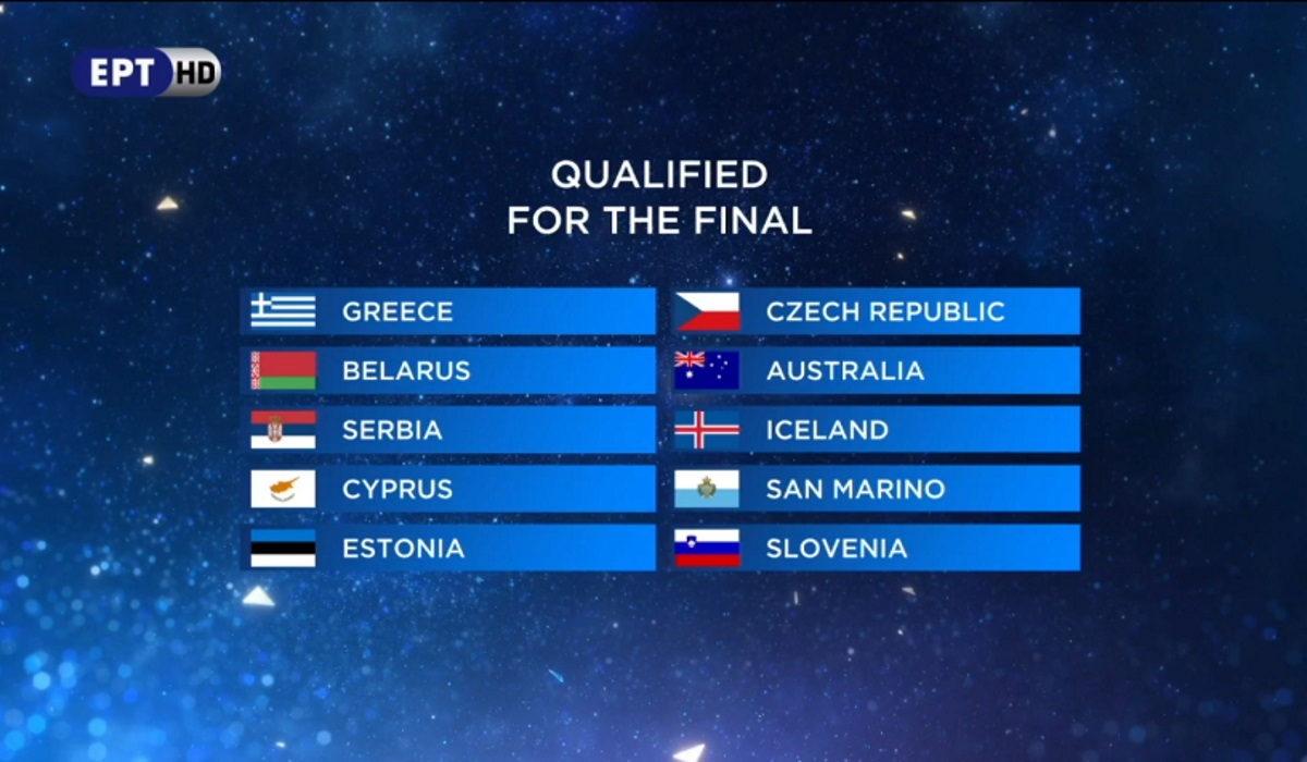 Οι 10 πρώτες χώρες που προκρίθηκαν στον μεγάλο τελικό είναι οι: ΕΛΛΑΔΑ, Λευκορωσία, Σερβία, ΚΥΠΡΟΣ, Εσθονία, Τσεχία, Αυστραλία, Ισλανδία, Σαν Μαρίνο και Σλοβενία.
