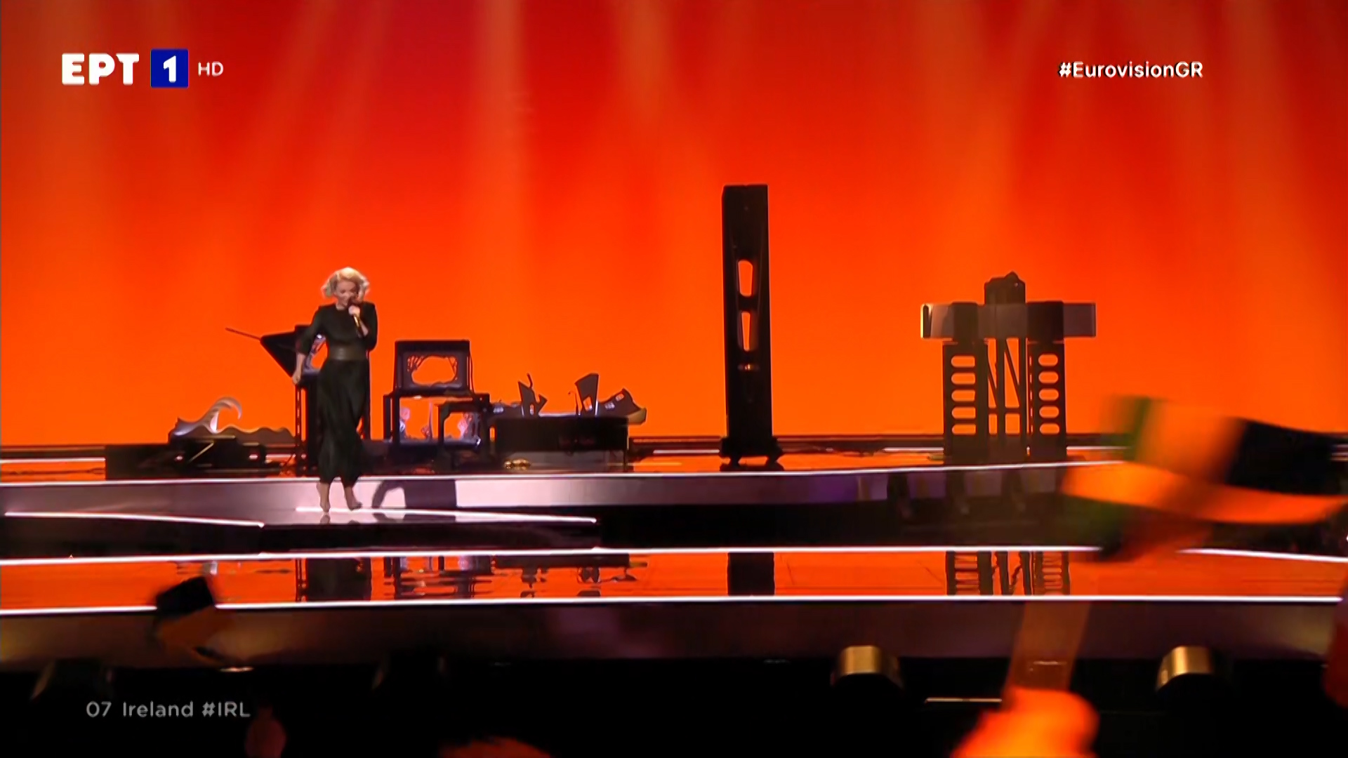 22:36 Η Ιρλανδία πραγματοποιεί μια από τις πιο ιδιαίτερες σκηνικές παρουσιάσεις της βραδιάς. Γι’ αυτό τον λόγο οι παρουσιαστές ζητούν λίγο χρόνο παραπάνω μέχρι να τοποθετηθεί το σκηνικό. Η Lesley Roy σε κινείται σε ένα χάρτινο σκηνικό που εντυπωσιάζει και καίγεται! Ωστόσο, η ερμηνεία της με το “Maps” έχει κάποια προβληματάκια.