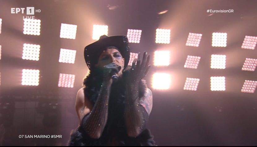 22:37 Η έβδομη χώρα που ανεβαίνει στη σκηνή είναι το Σαν Μαρίνο, με τον Achille Lauro να ερμηνεύει το «Stripper».