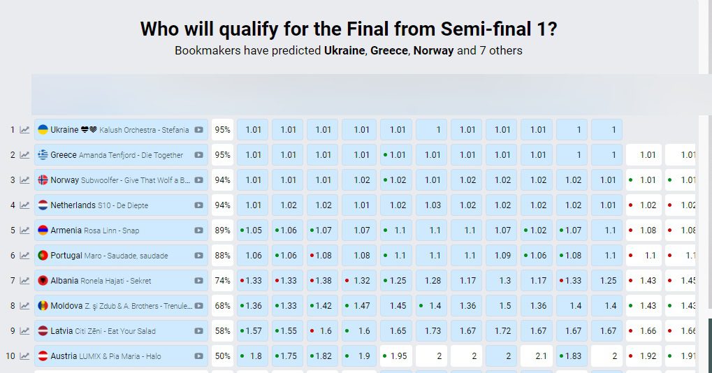 Σύμφωνα με τα διεθνή γραφεία στοιχημάτων, λίγες ώρες πριν τον πρώτο ημιτελικό, η χώρα μας βρίσκεται στην 2η θέση και φυσικά έτσι παίρνει την πρόκριση στον τελικό.