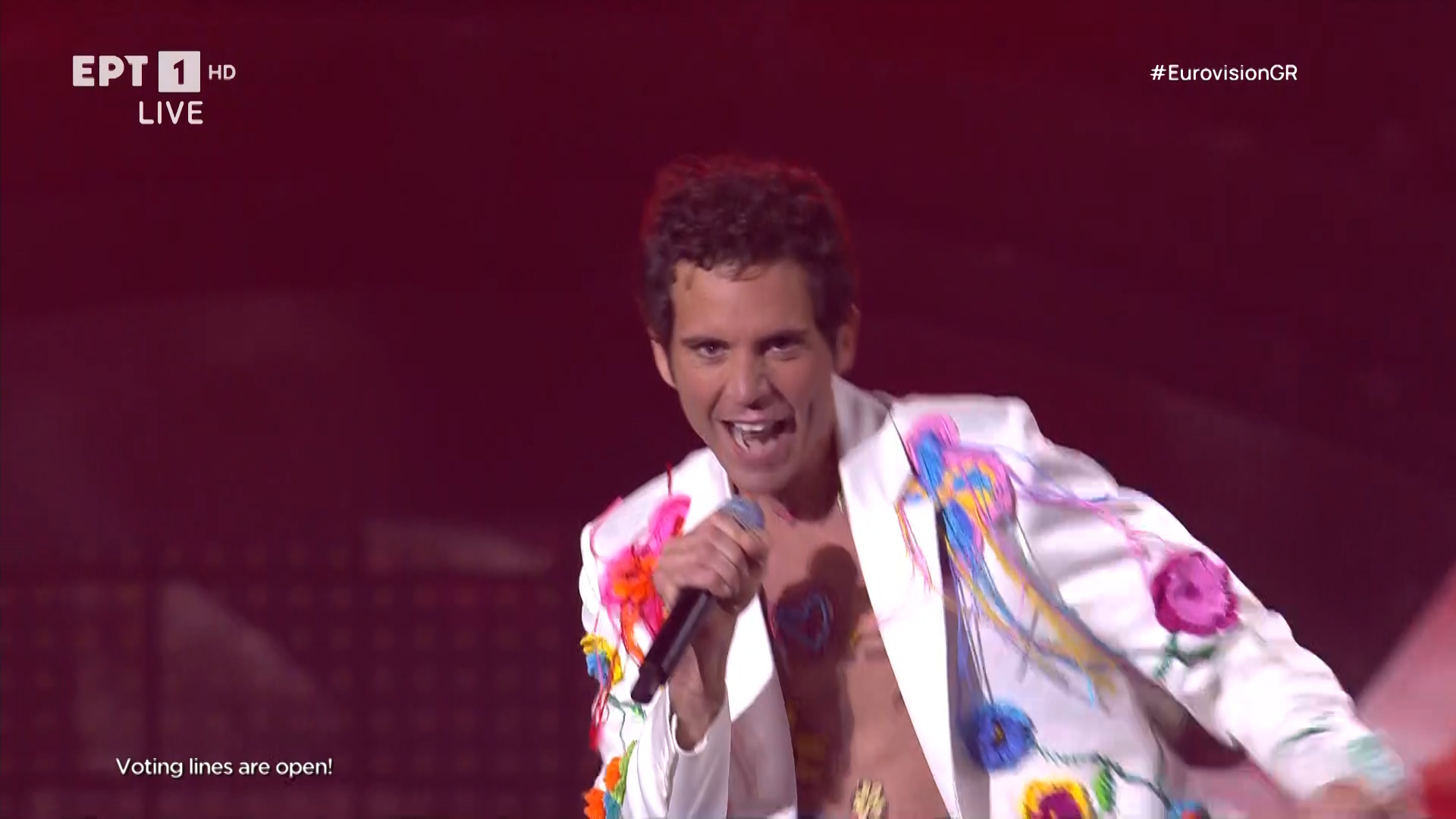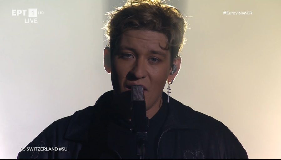 22:33 Ο Marius Bear δημιουργεί ατμόσφαιρα με το Boys Do Cry για την Ελβετία. Ο τραγουδιστής εμφανίζεται με ένα ωραίο εφέ, μία σπασμένη καρδιά επάνω στο πρόσωπό του.